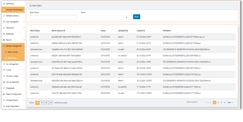 Fields in listing — Batch Name, Batch Instance ID, Status (All / Pending / Processing / Completed / Failed), Uploaded By, Created At, File Name. Click batch to see Process/Reject/Success counts and download rejected records.