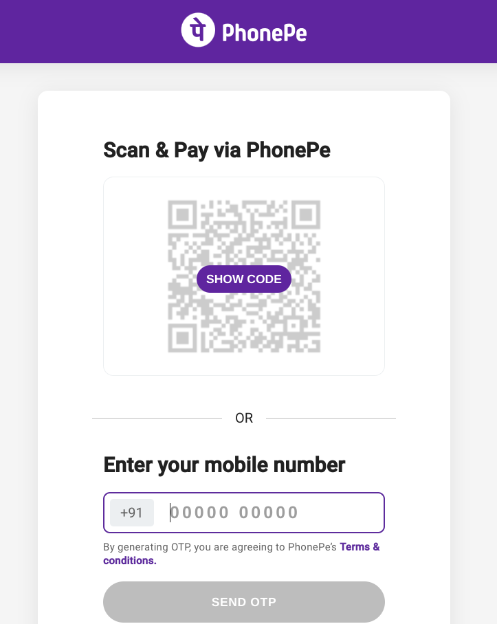 For PhonePe Wallet, the redirection takes to PhonePe page where customer can initiate a transaction using PhonePe App
