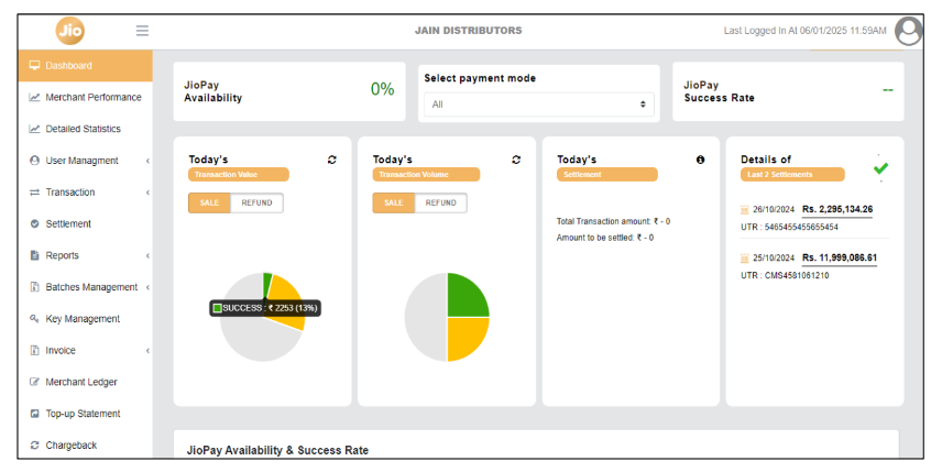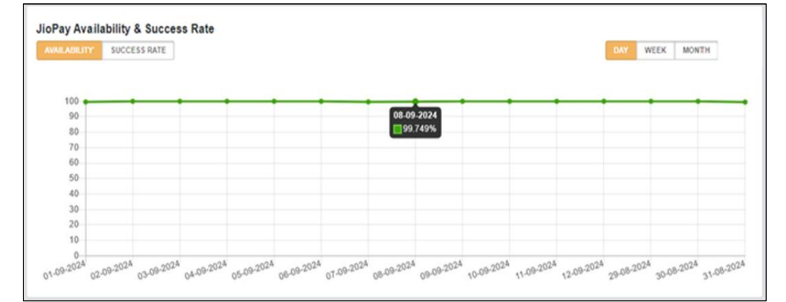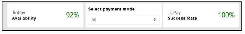 - JioPay Availability & Success Rate: platform technical availability and success rate consolidated & payment-mode wise for selectable periods (today / last 30 days / 4 weeks / 3 months).