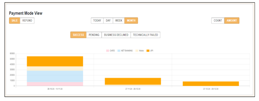 - Payment Mode View: performance per payment mode (count/value/status) for chosen period.