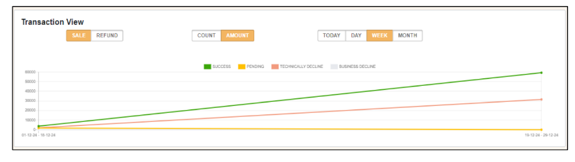 - Today’s Transaction Value: shows Sale & Refund amount; hover reveals color-coded status (Green = success, Amber = requested, Red = technically failed, Grey = business-declined).
