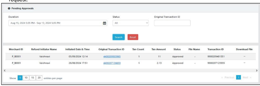 d) Maker-Checker (bulk & single refunds) — maker uploads or initiates refund; checker approves/declines from Pending Approval screen. Approver can view original transaction details before approving. Notifications are emailed on rejection/approval.