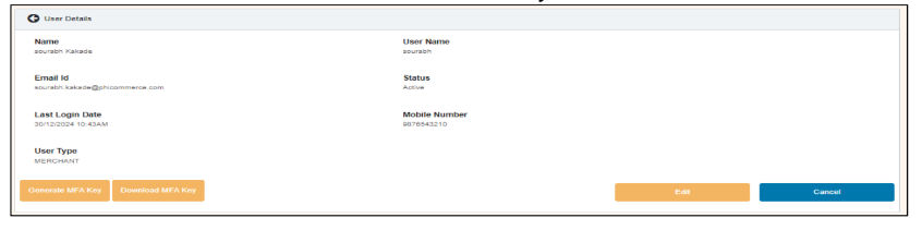 - Extra actions: Generate MFA Key → download & share with user; user configures Google Authenticator with UserID + key.