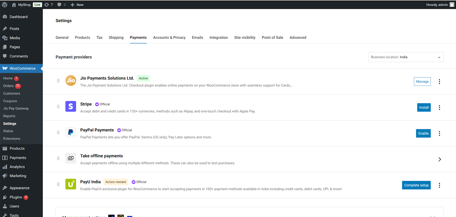 WooCommerce → Settings → Payments → Jio Payment Solution Ltd. → Manage