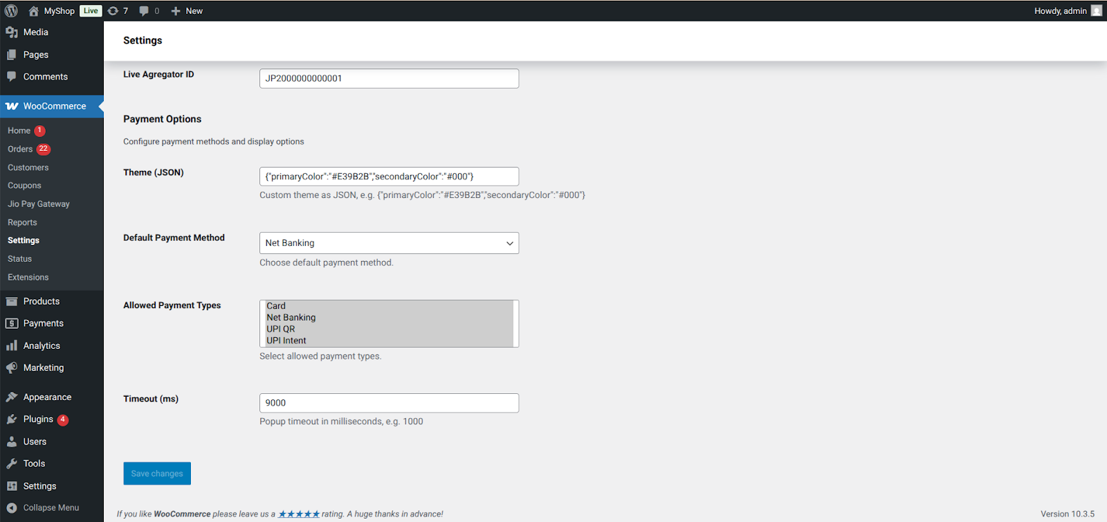 The Jio Payments WooCommerce Plugin enables merchants to easily accept Cards, NetBanking, UPI QR, UPI Intent, and UPI VPA directly on their WooCommerce store.